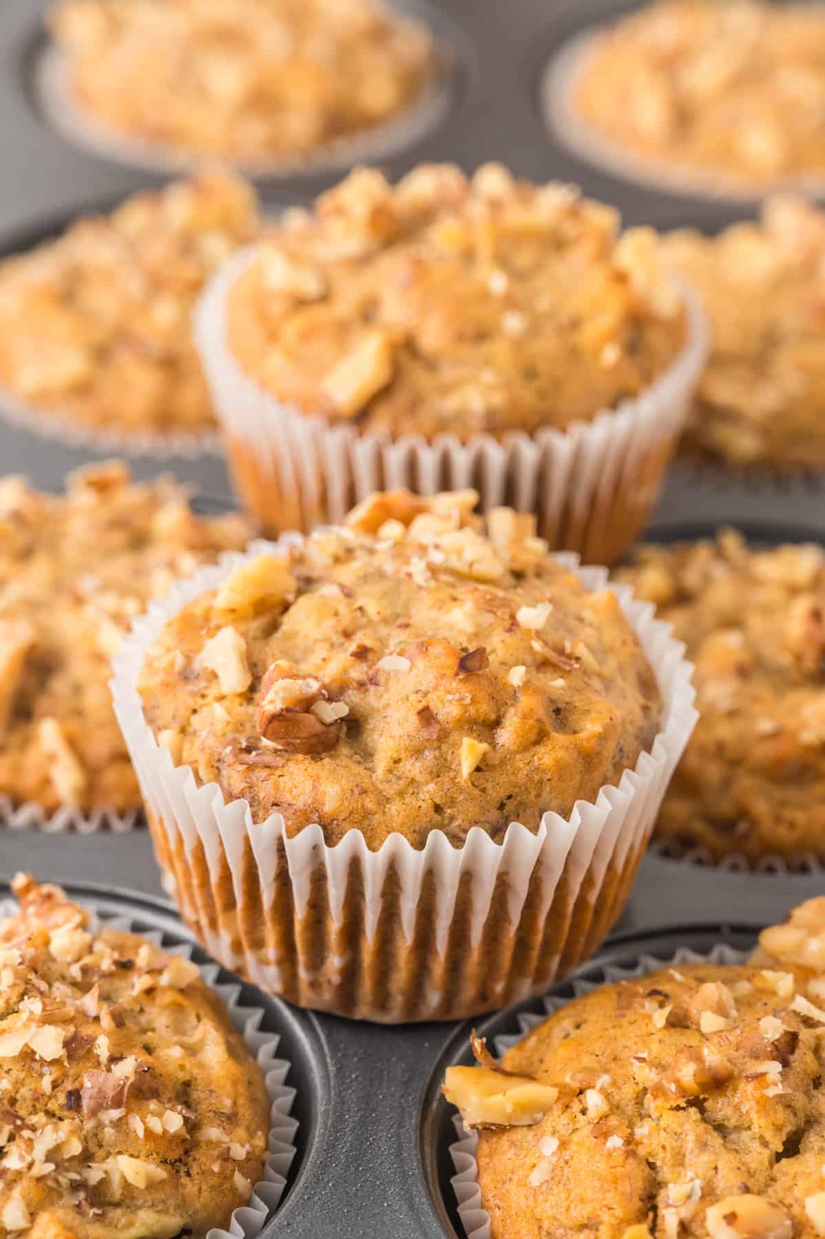 - Step 4: Fill the muffin tin. Scoop the batter into the prepared liners, about ¼ cup per muffin, and sprinkle the remaining walnuts on top.