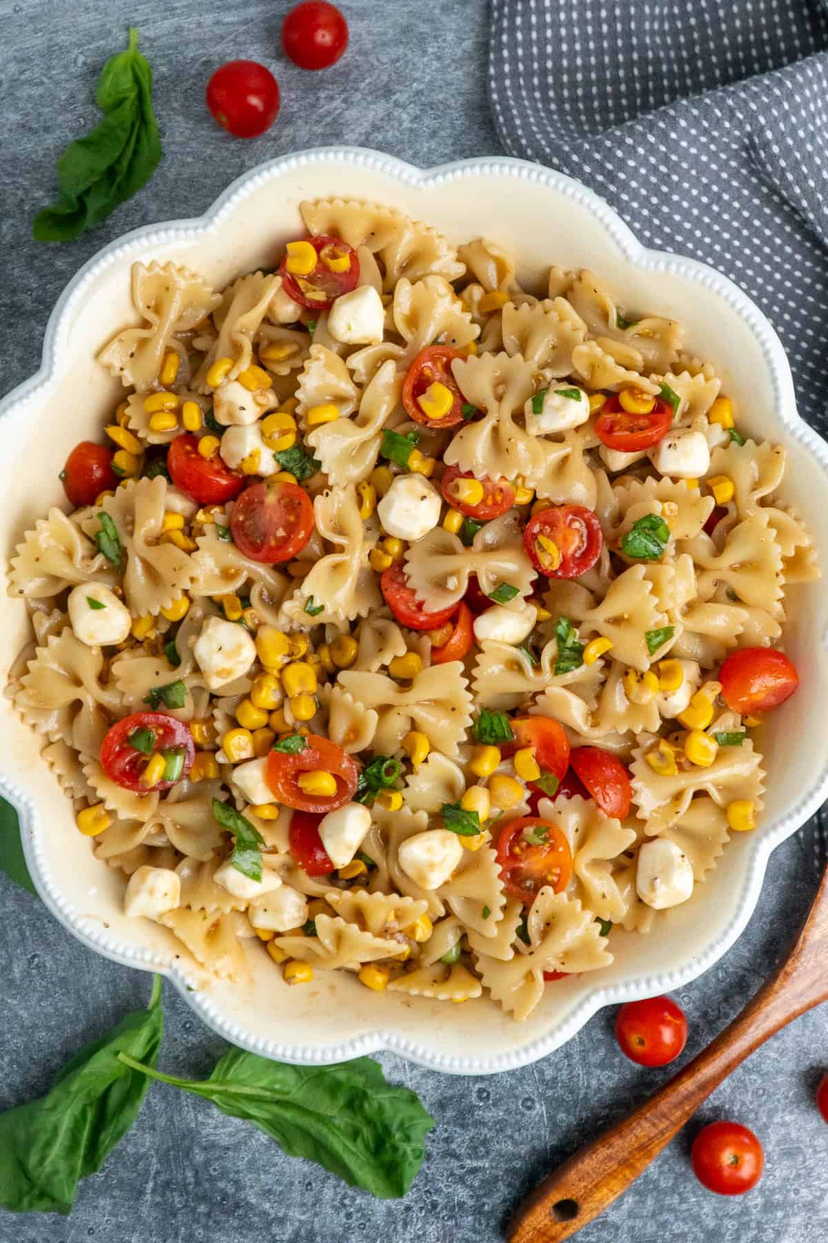 - Step 3: Assemble the Salad. Add the cooled pasta to a large bowl with the tomatoes, mozzarella pearls, fire-roasted corn, green onions, and most of the basil. Pour the dressing over the top and toss gently until everything is coated.