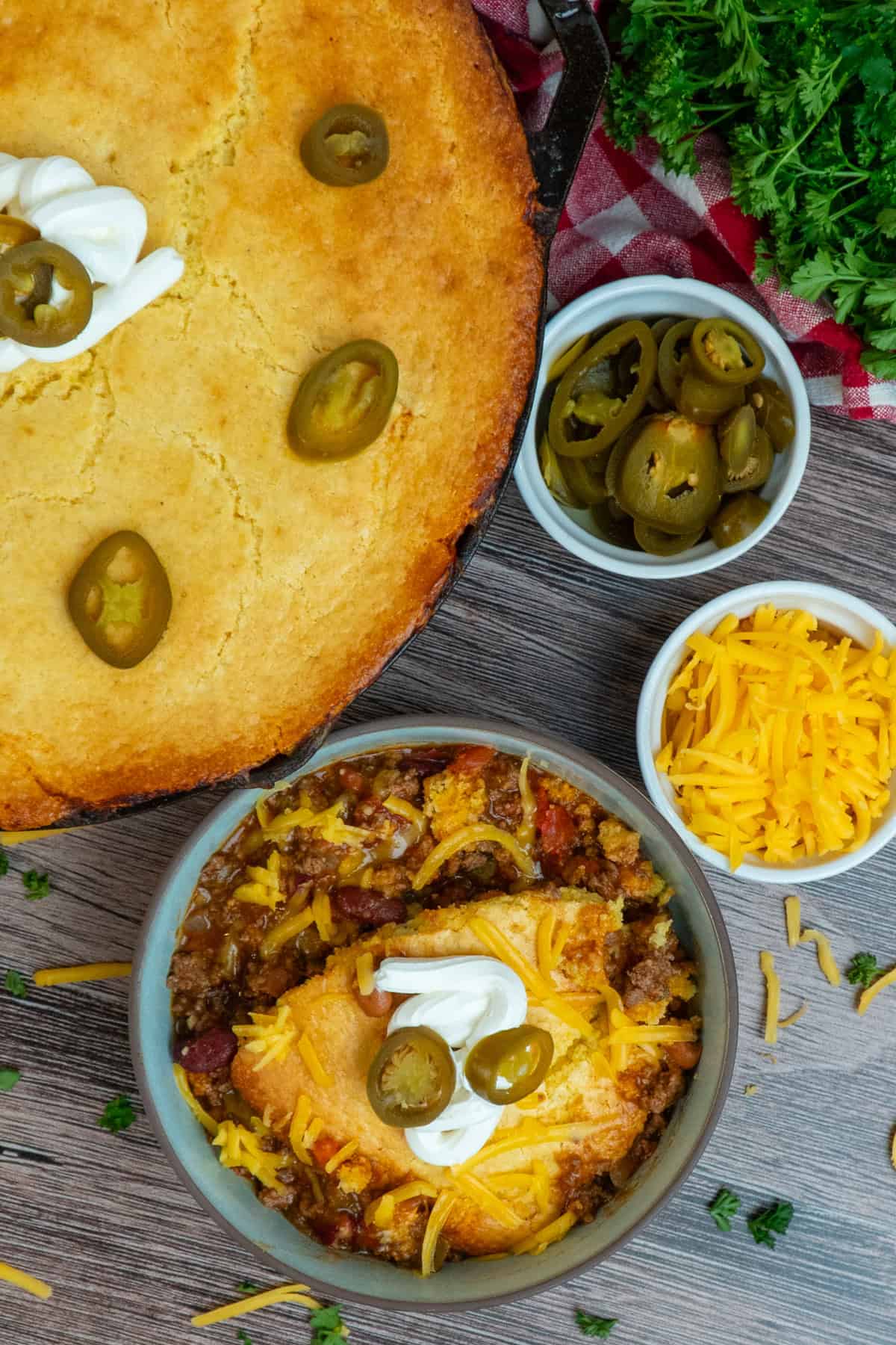 - Bake for 25-30 minutes, or until the cornbread is golden and set. Top with your favorite chili toppings and serve.