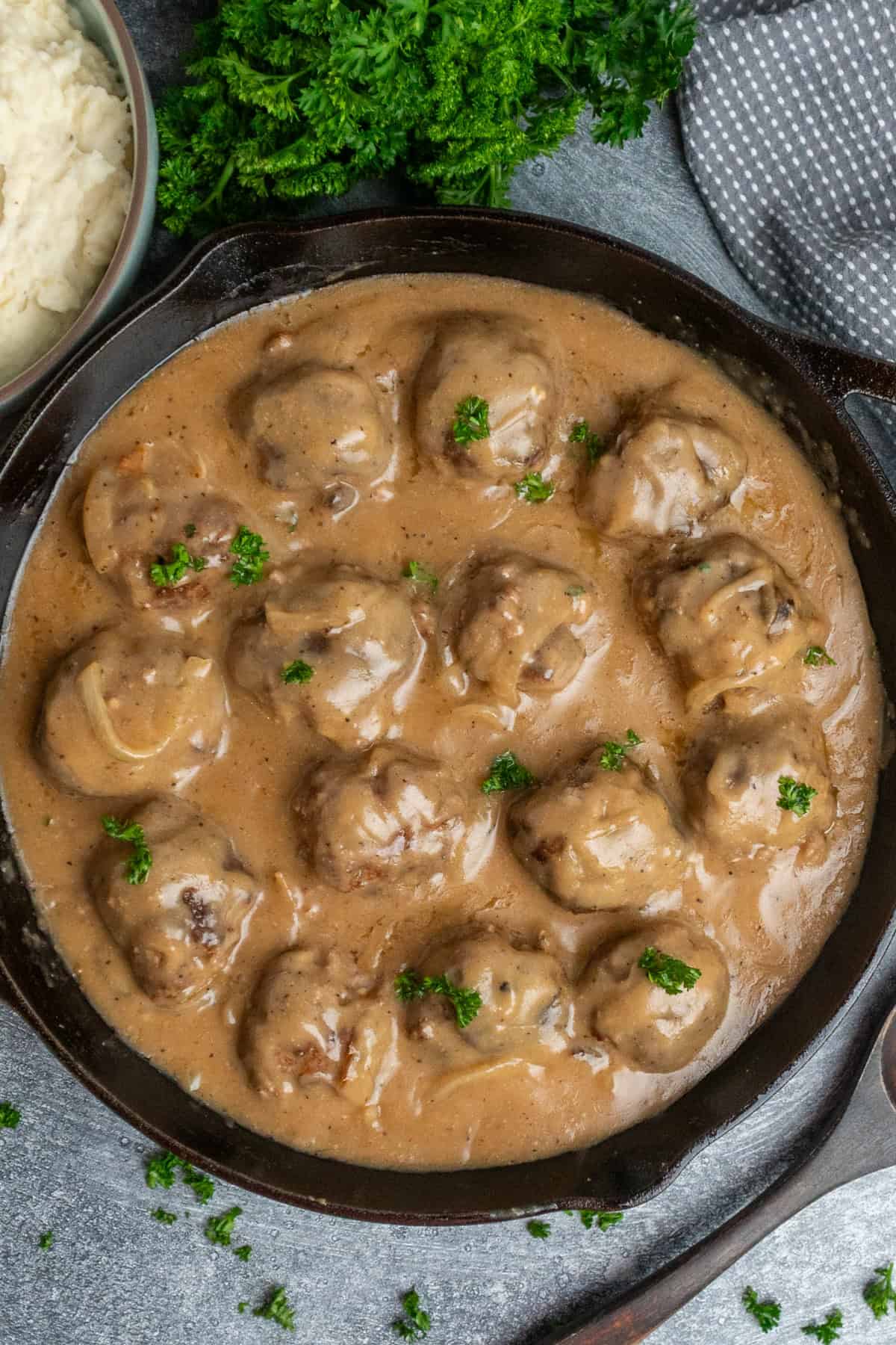 - Step 6: Simmer the Meatballs in Gravy. Return the onions and browned meatballs to the skillet, stirring gently to coat them in the gravy. Lower the heat and let everything simmer for 10 minutes so the flavors meld, then serve over garlic mashed potatoes or rice.